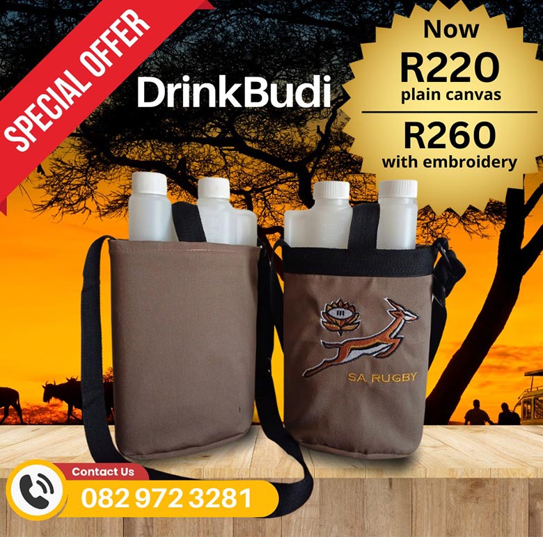 But that's not all - our DrinkBudi Bottle comes with a choice of stylish canvas bags, complete with a convenient strap. Choose from a plain bag, a bag featuring your favourite sports team's logo (like the Springboks!), or even create your own custom logo!